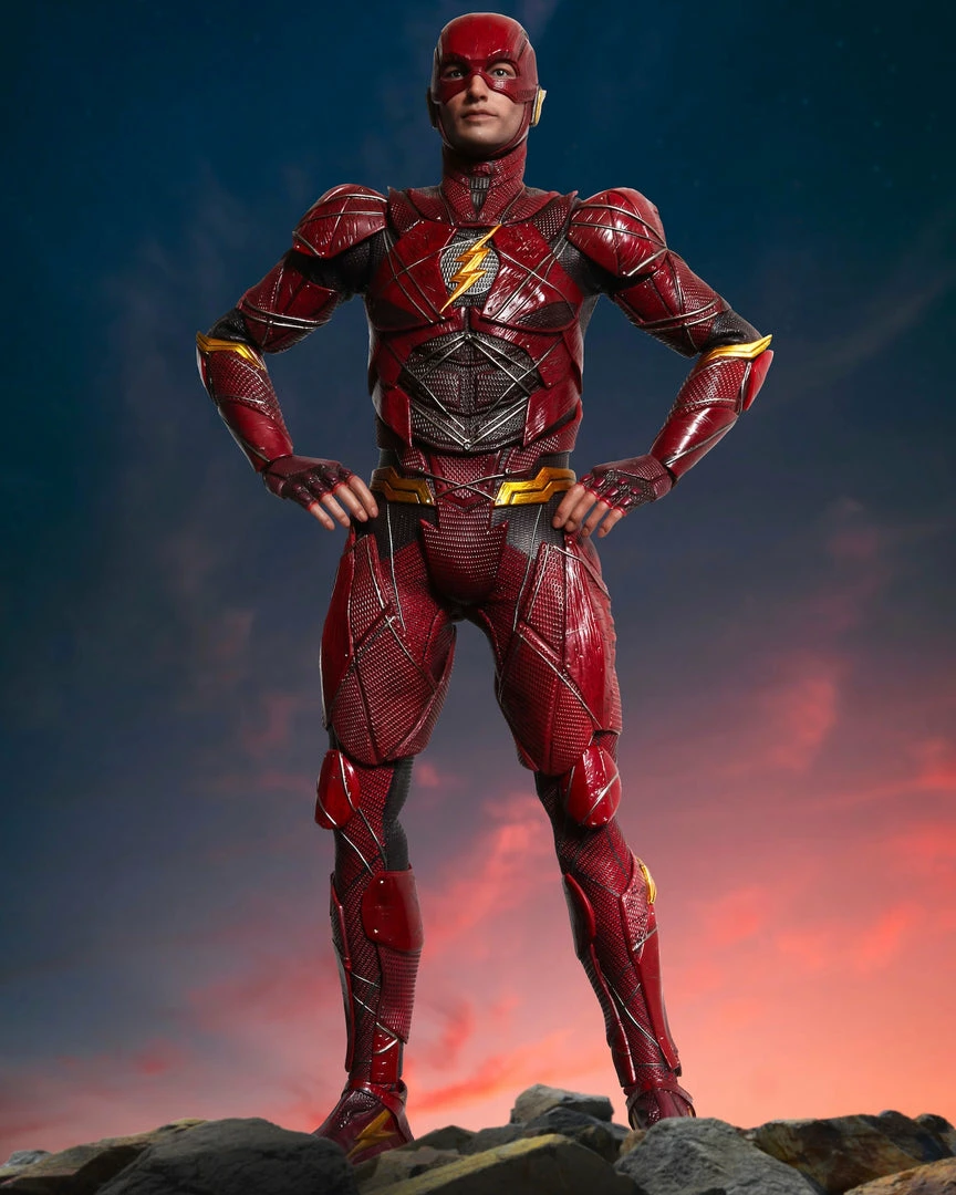 – One (1) specially tailored burgundy-colored Flash suit with red and gold colored armor plates and silver-colored lines