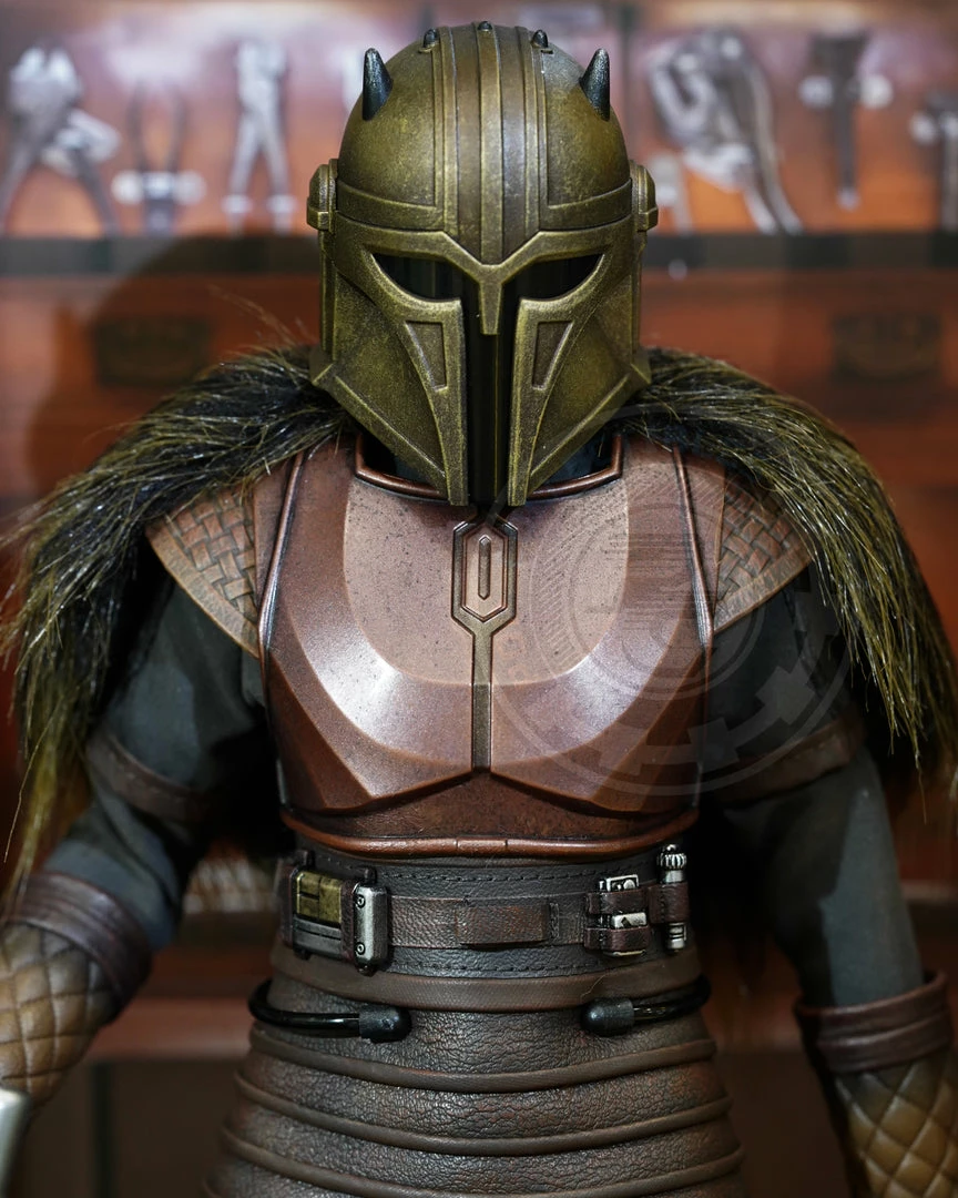 – Newly crafted golden bronze colored The Armorer helmet and bronze colored body armor with specially applied distress effects